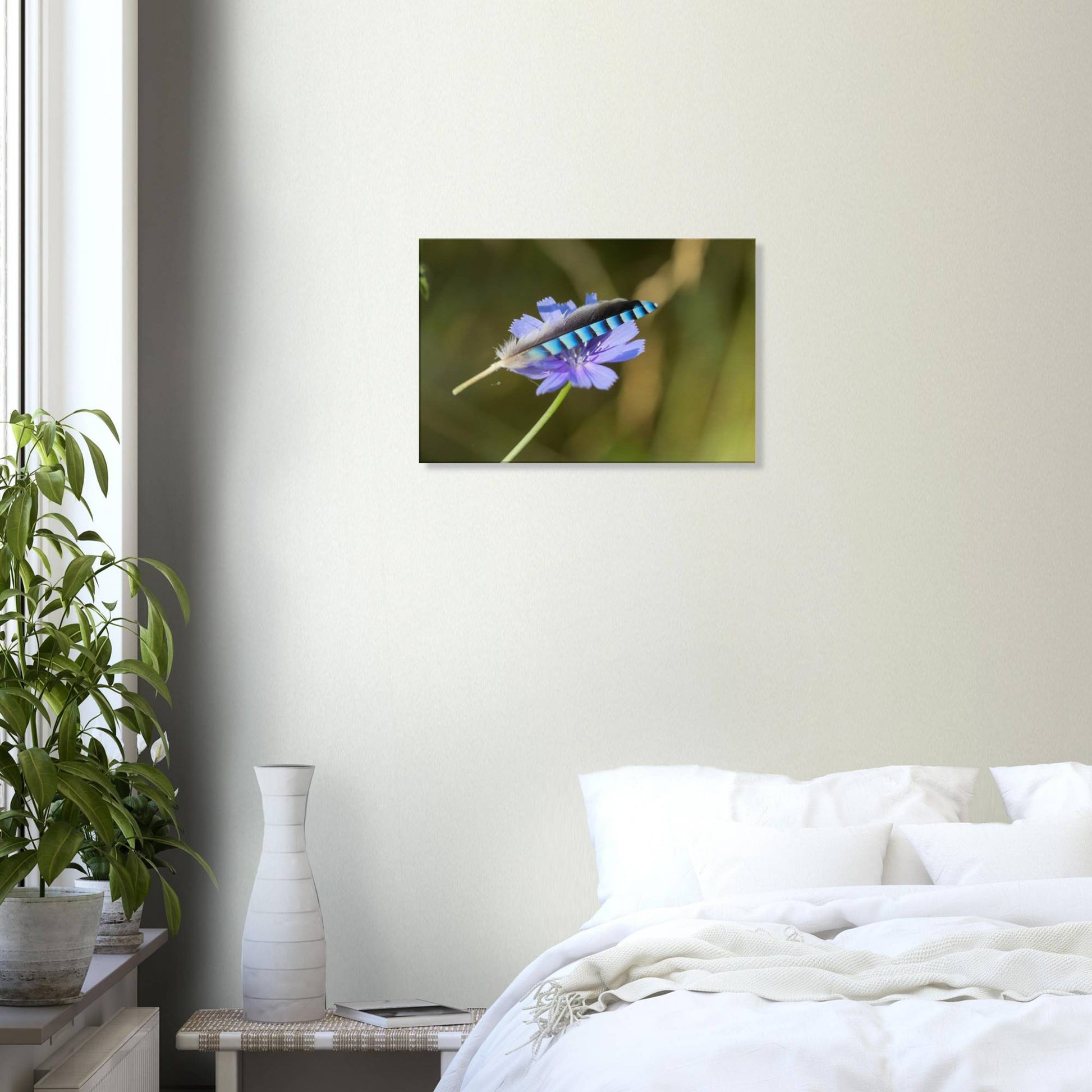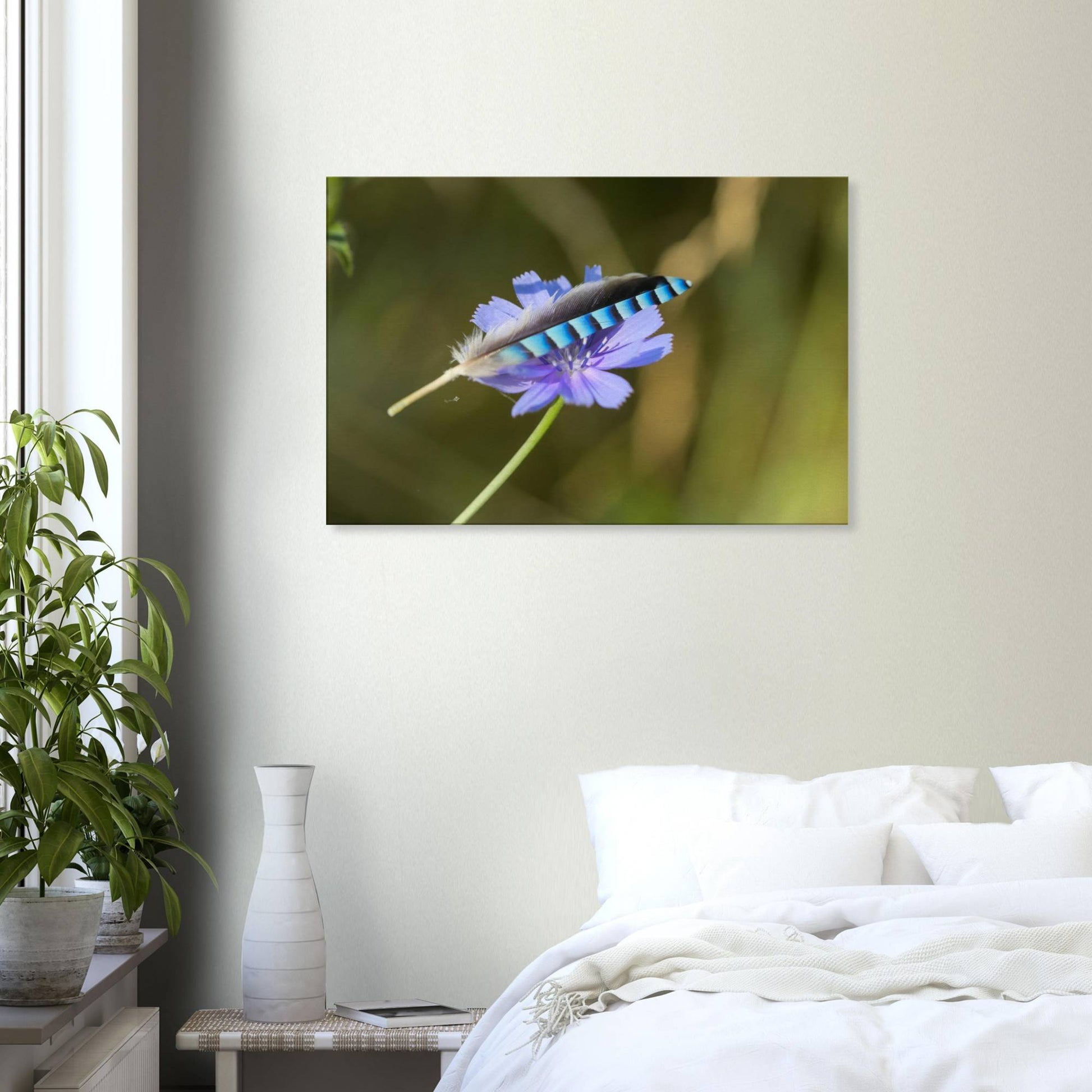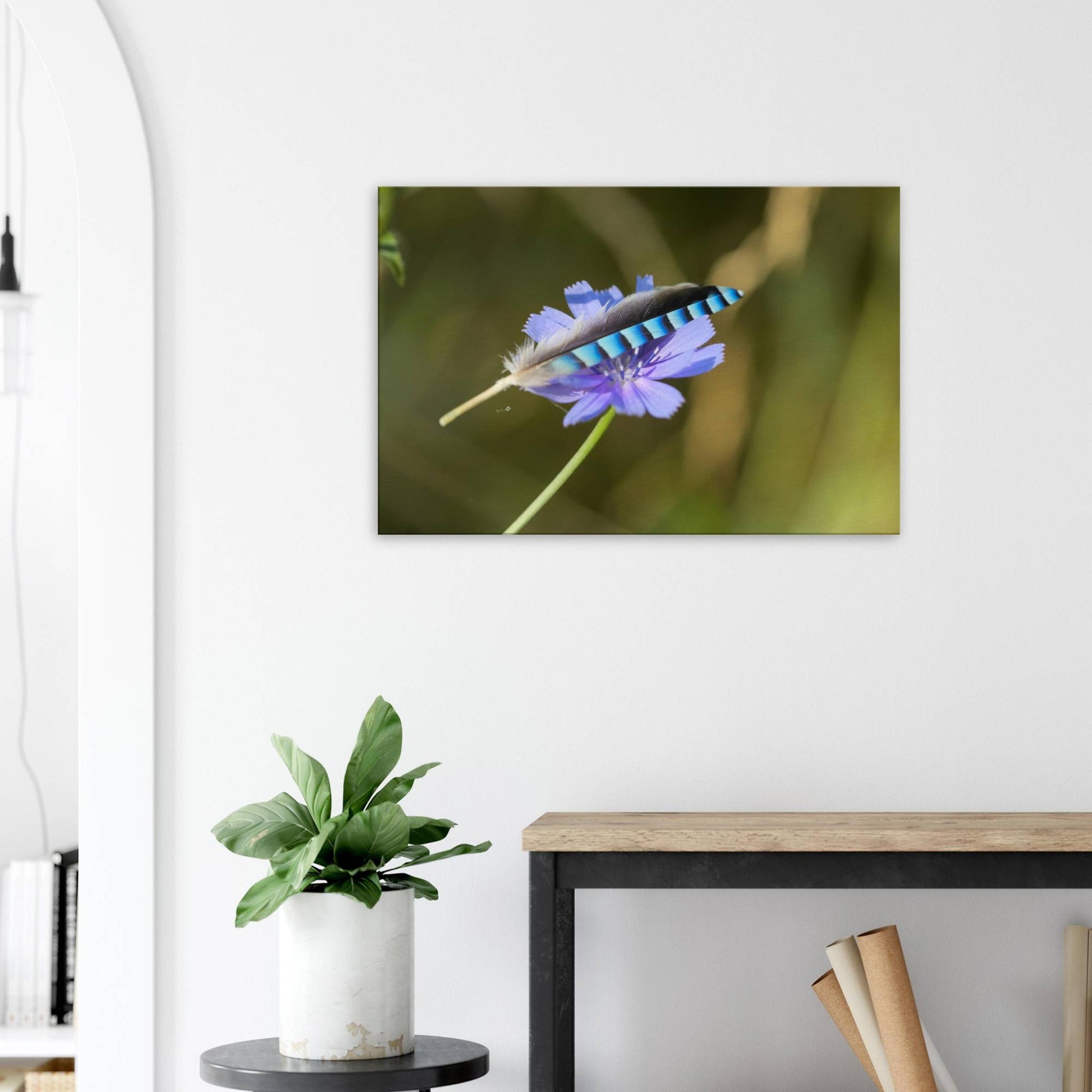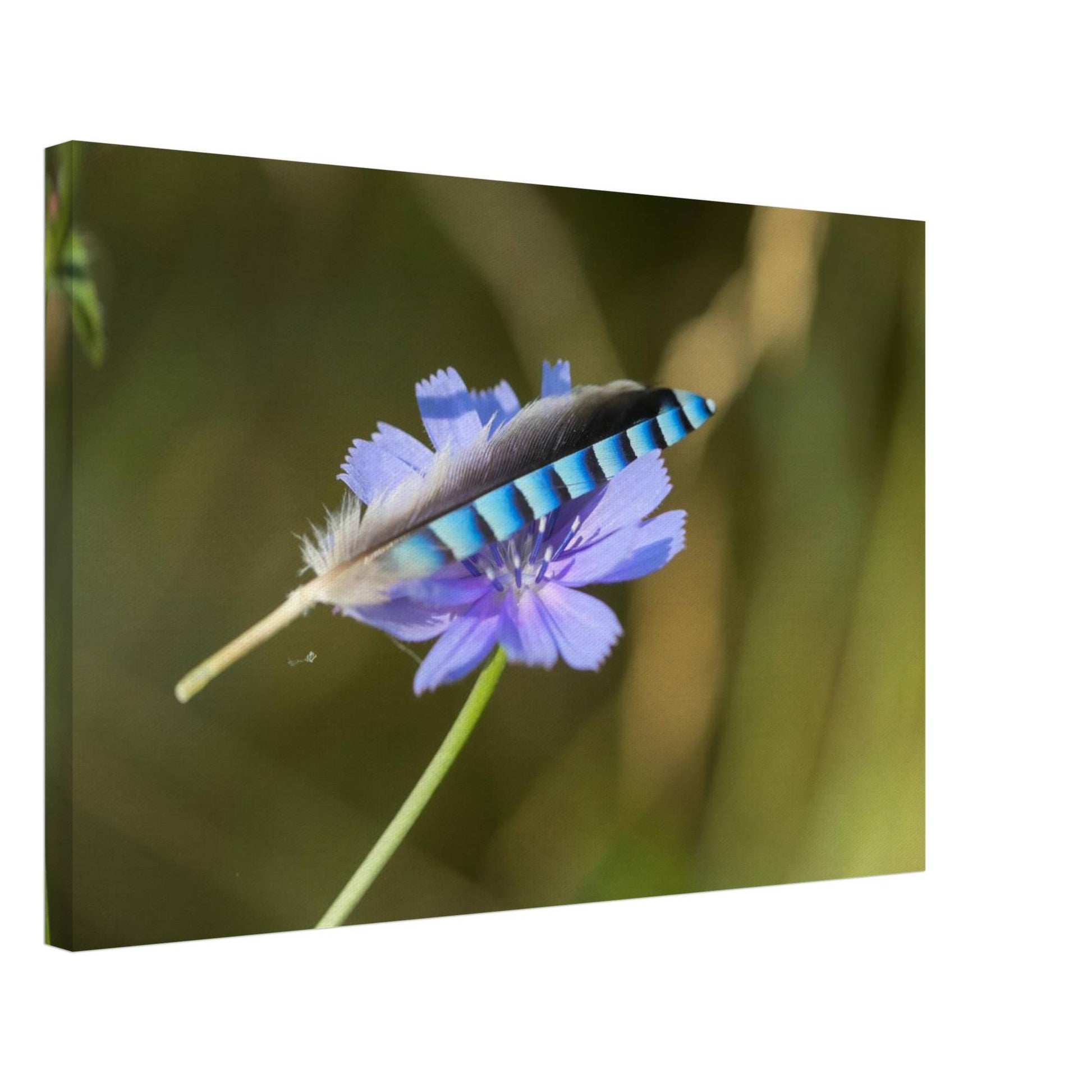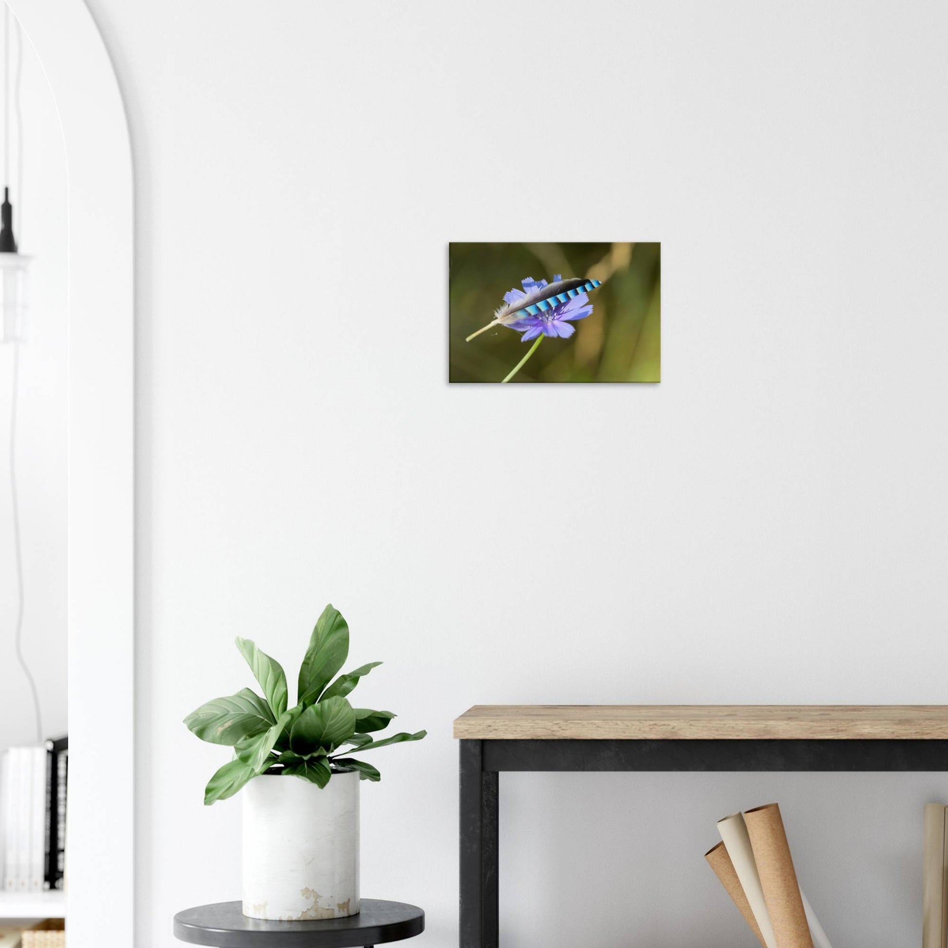 A serene scene of a black feather with blue stripes resting on a lila flower.