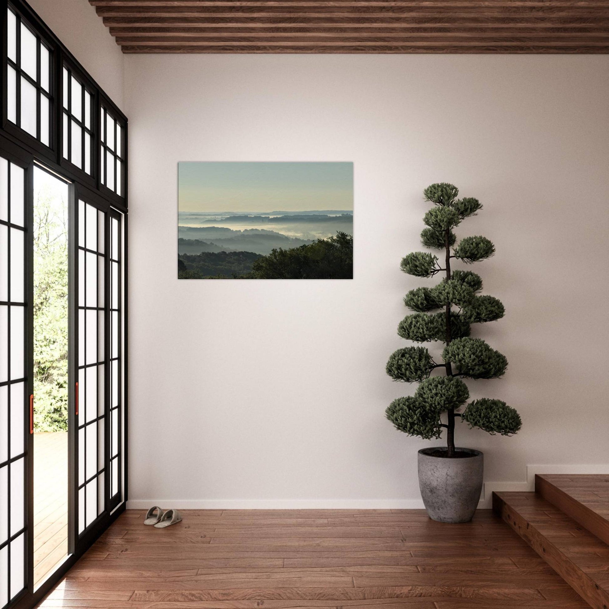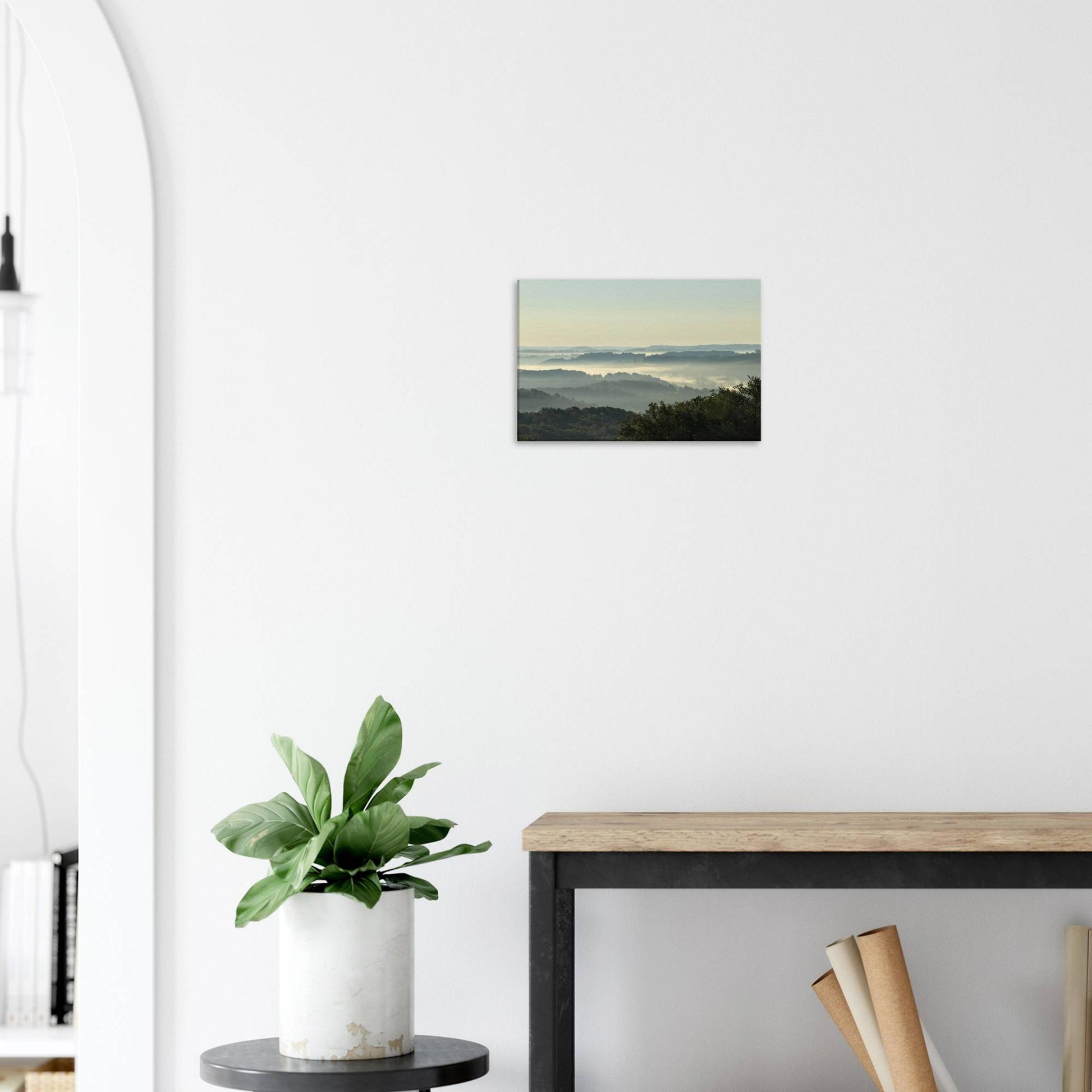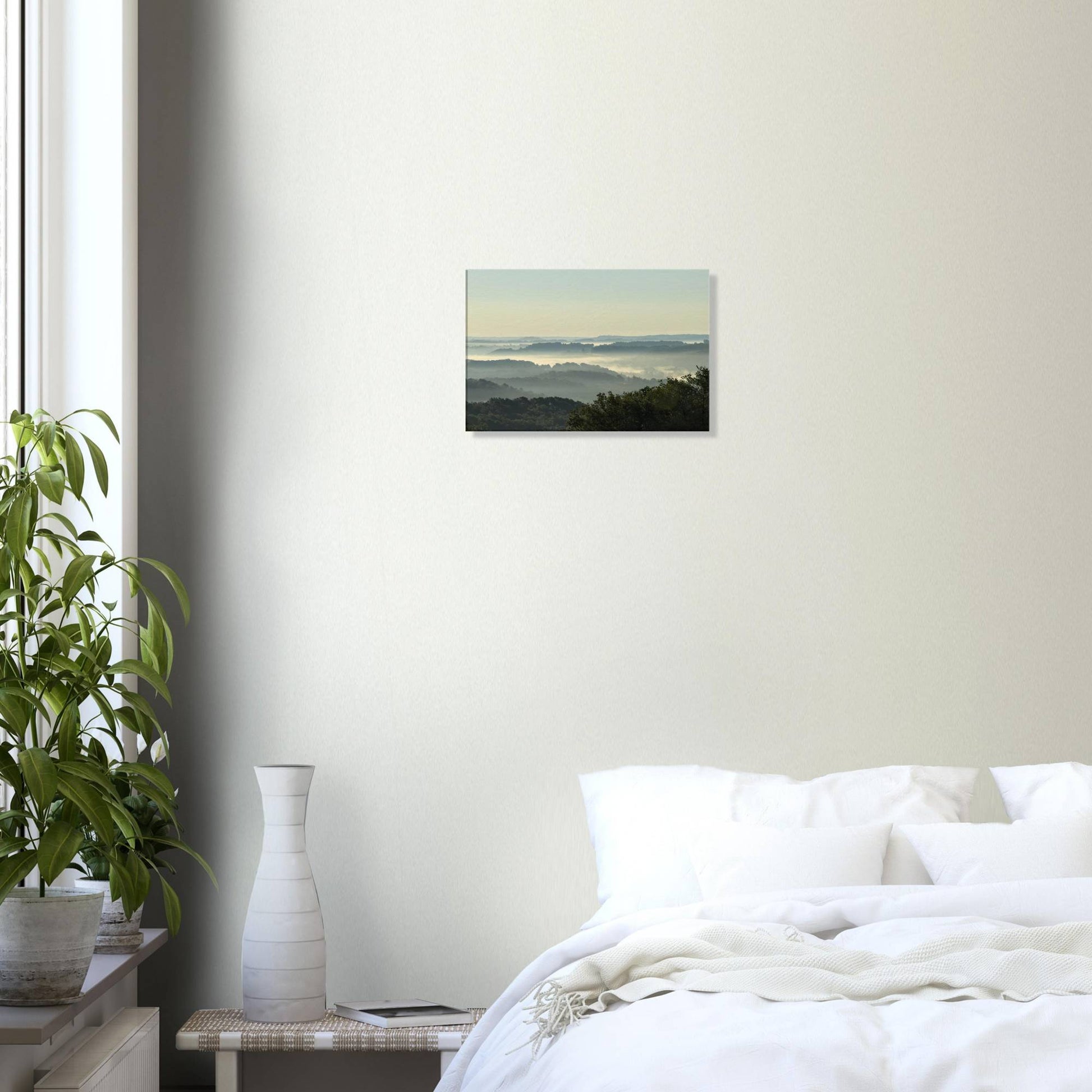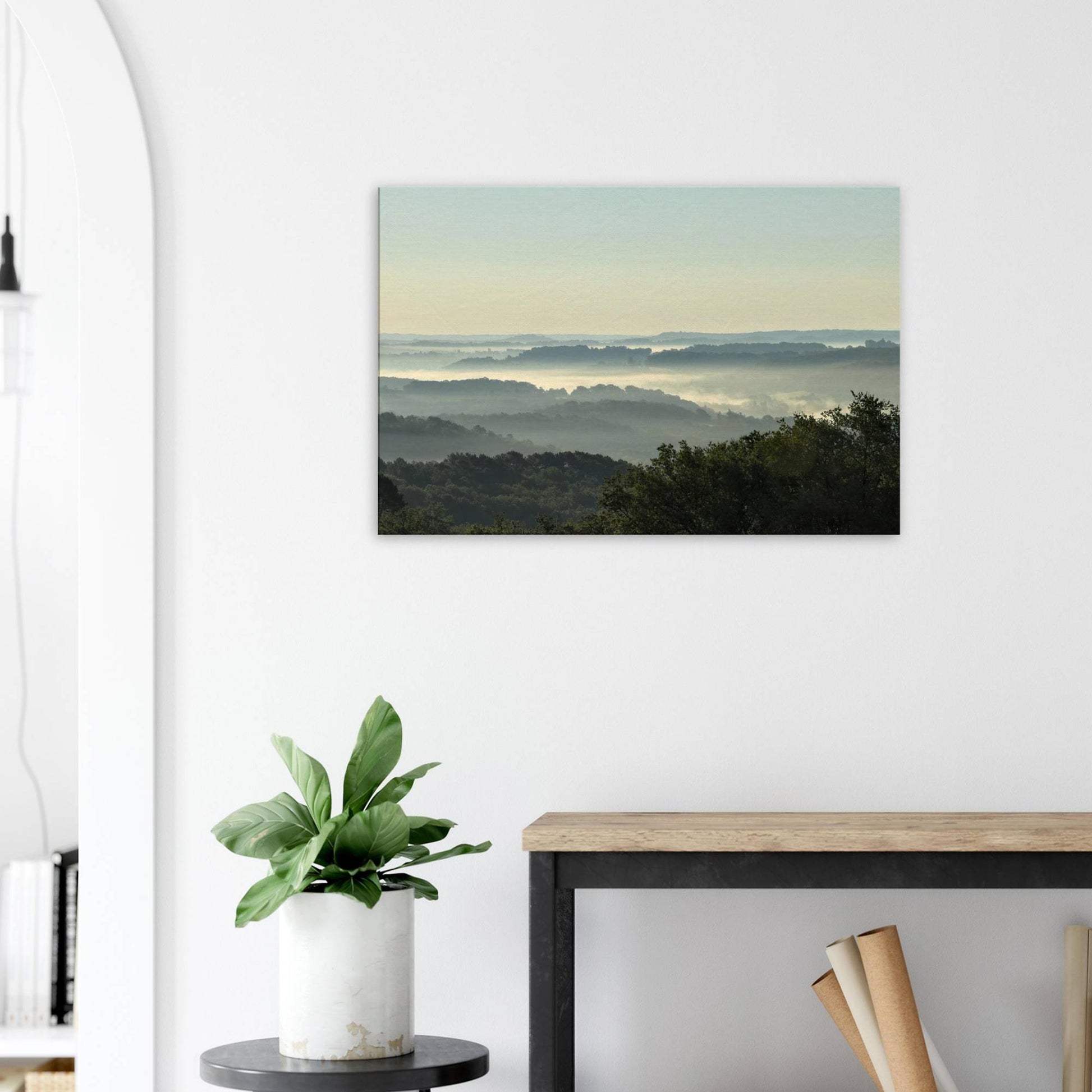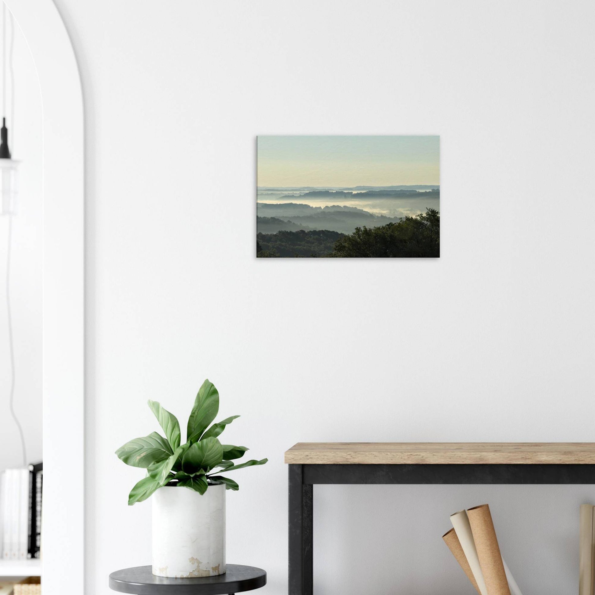 A stunning scene of an early sunrise watching over a diverse hilly landscape.