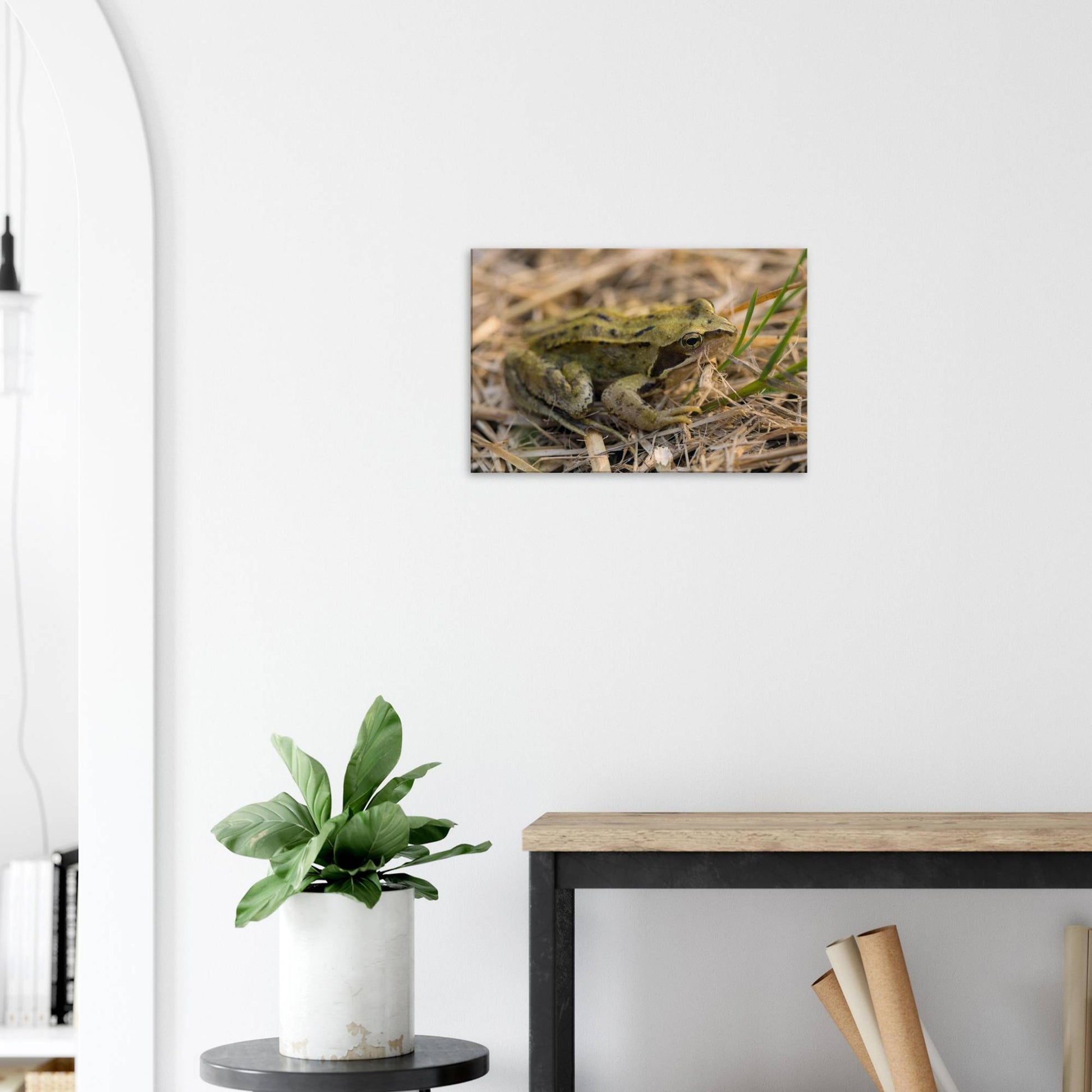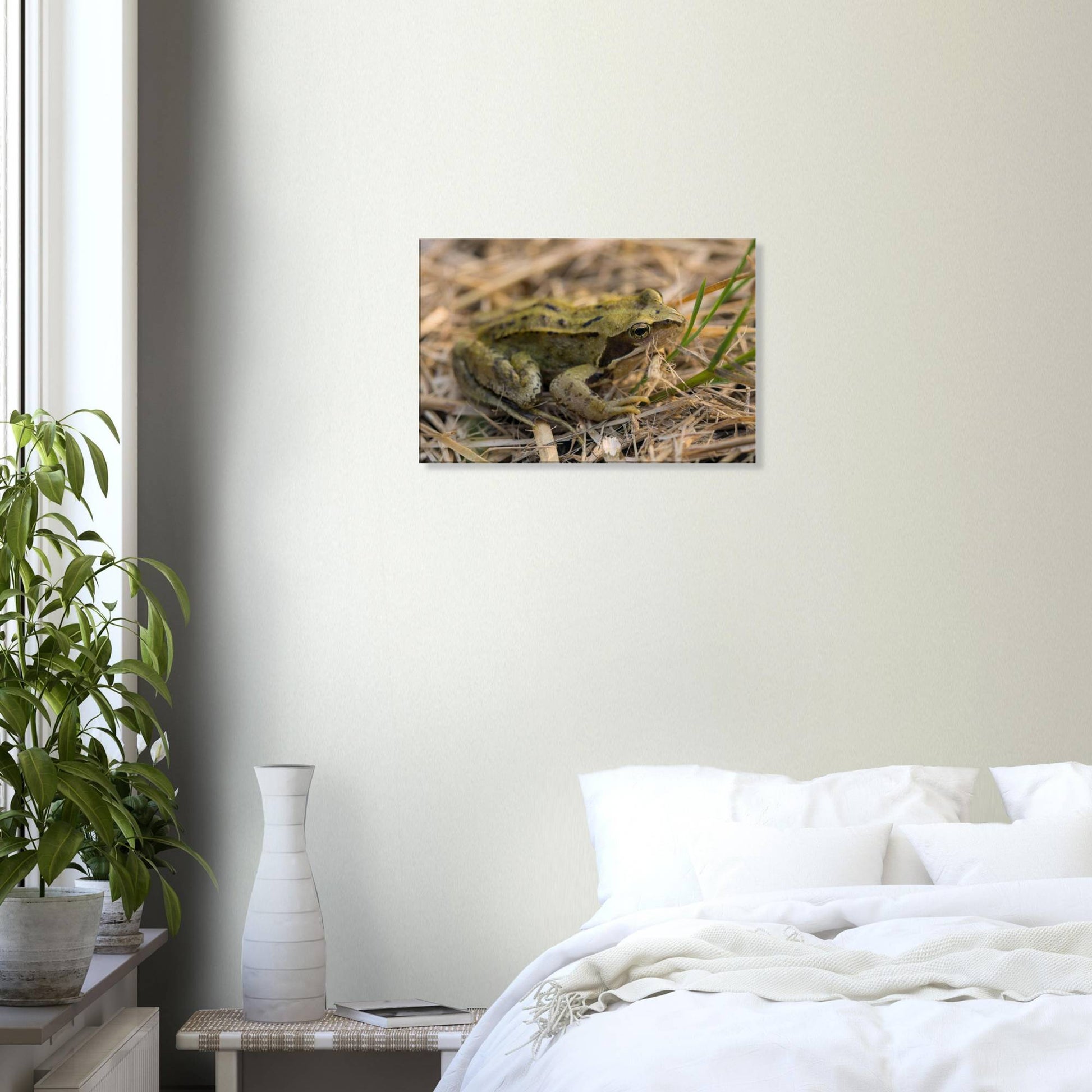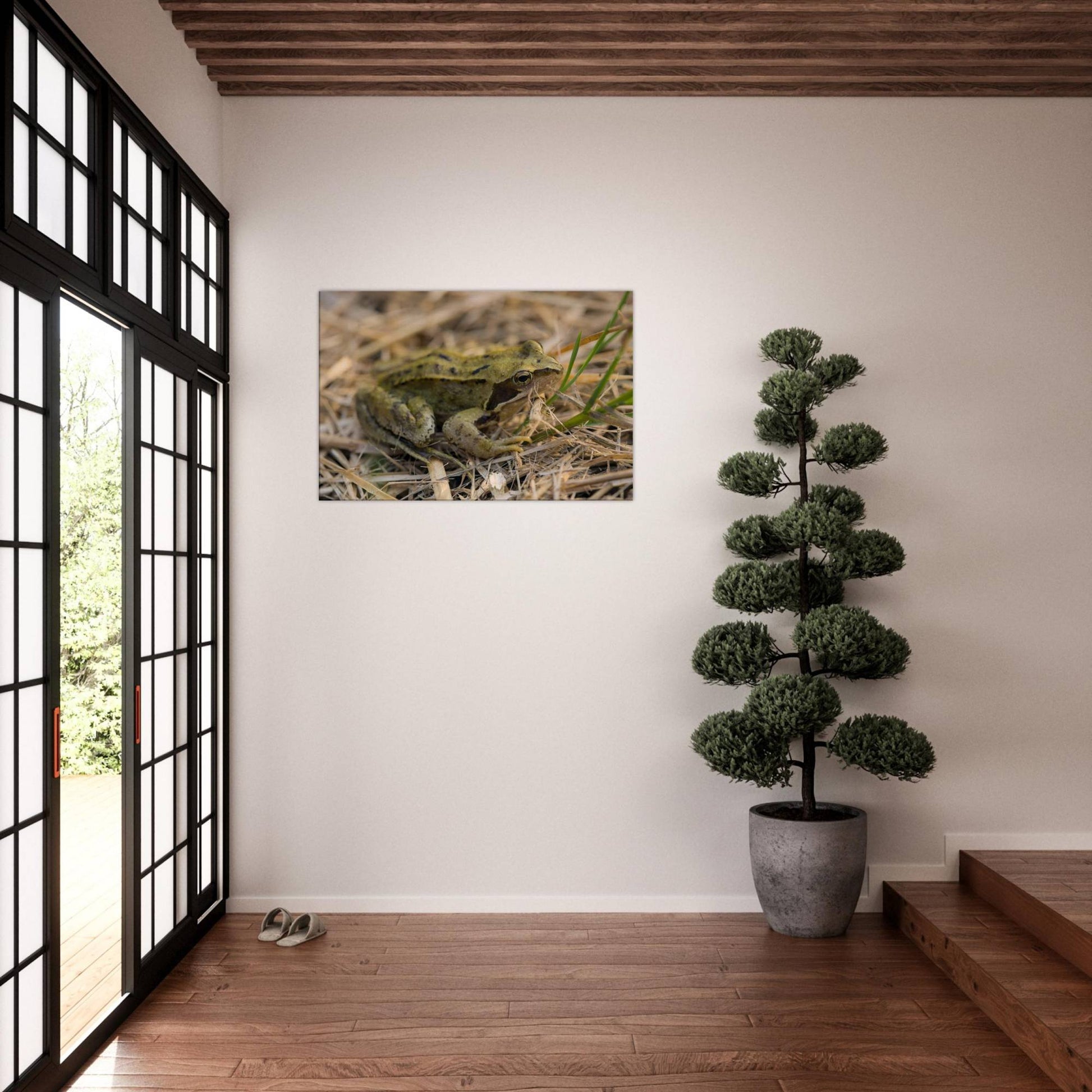 Not much going on here except for a little frog being at rest on blades of hay and grass.