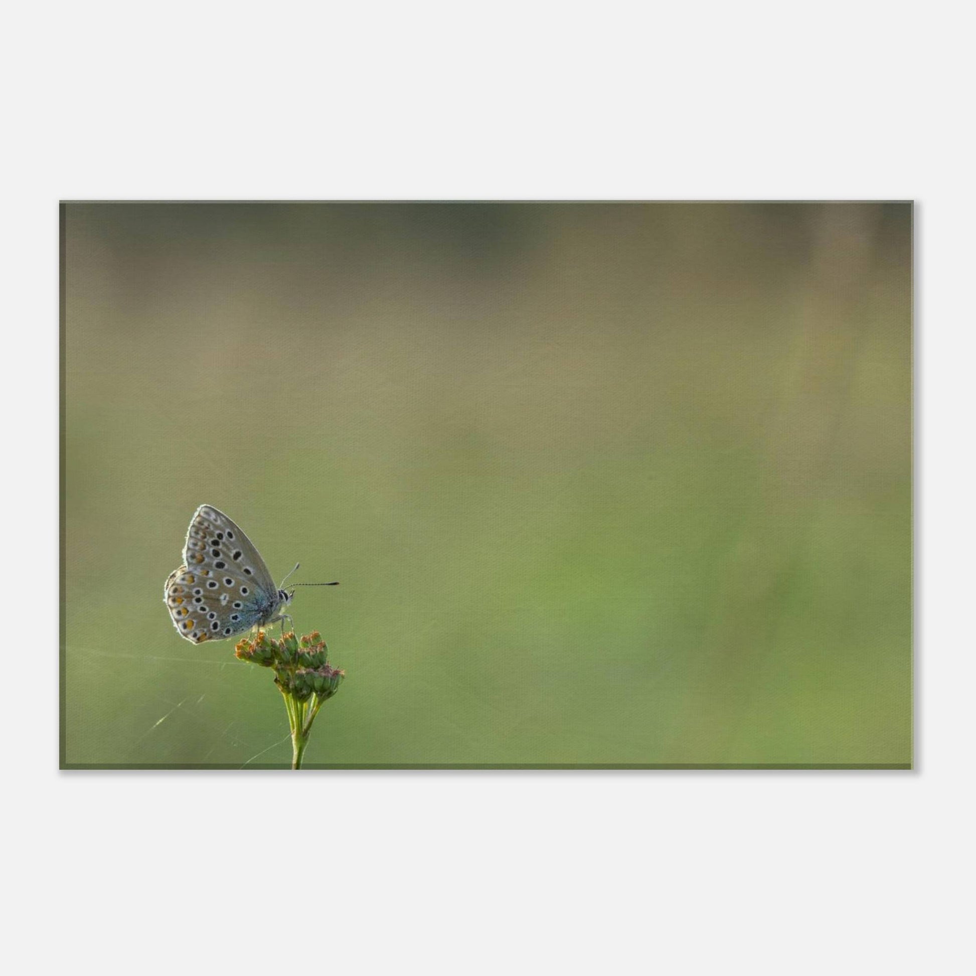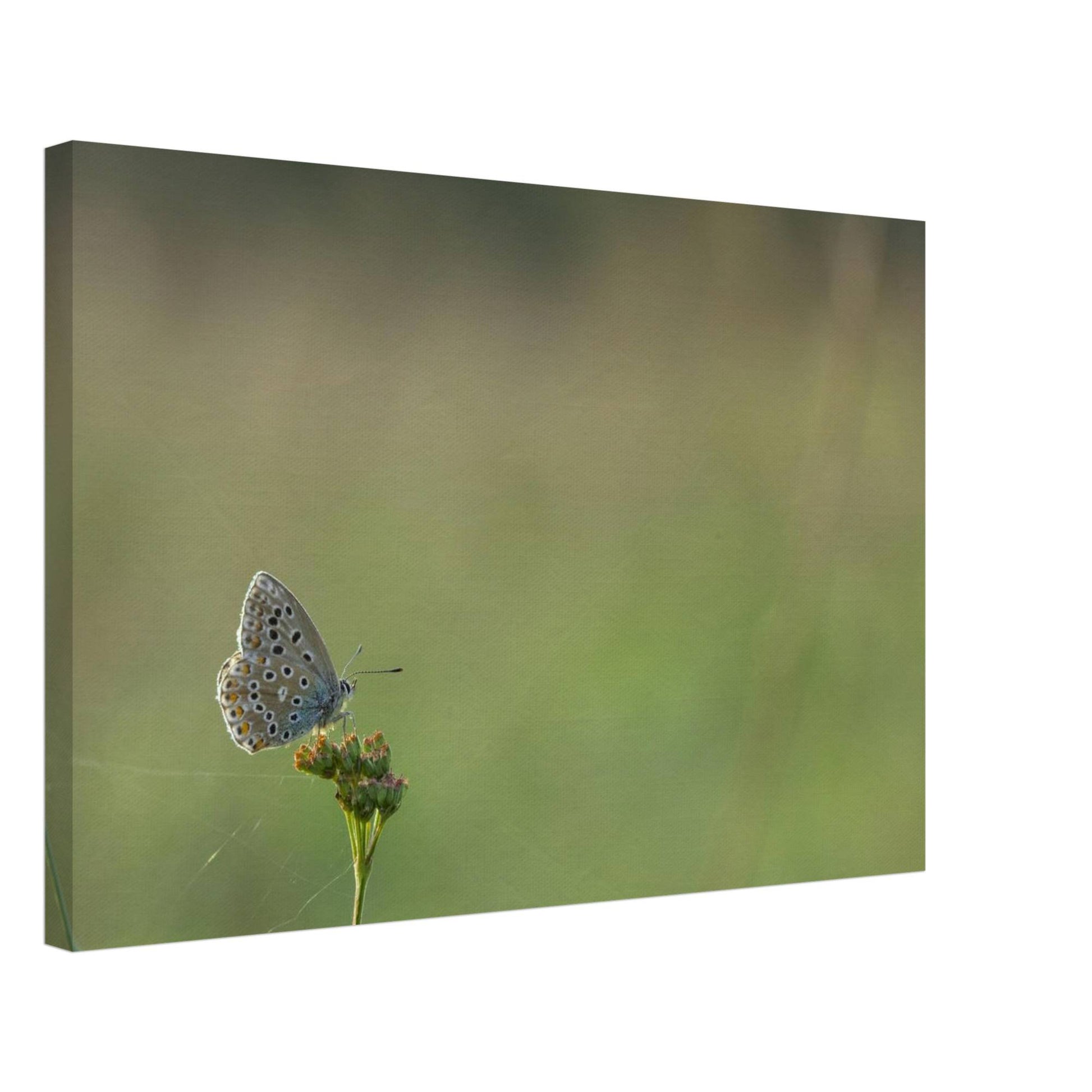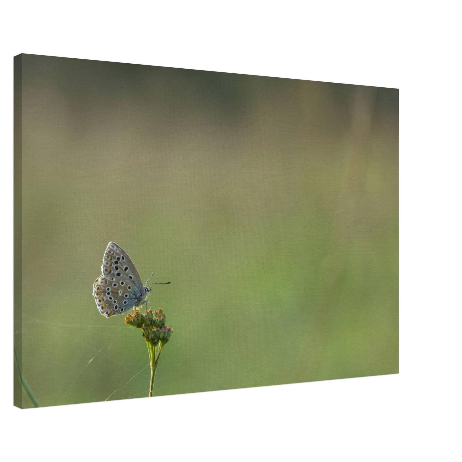 A Common Blue butterfly sitting on a flower that is held together by spiderwebs.