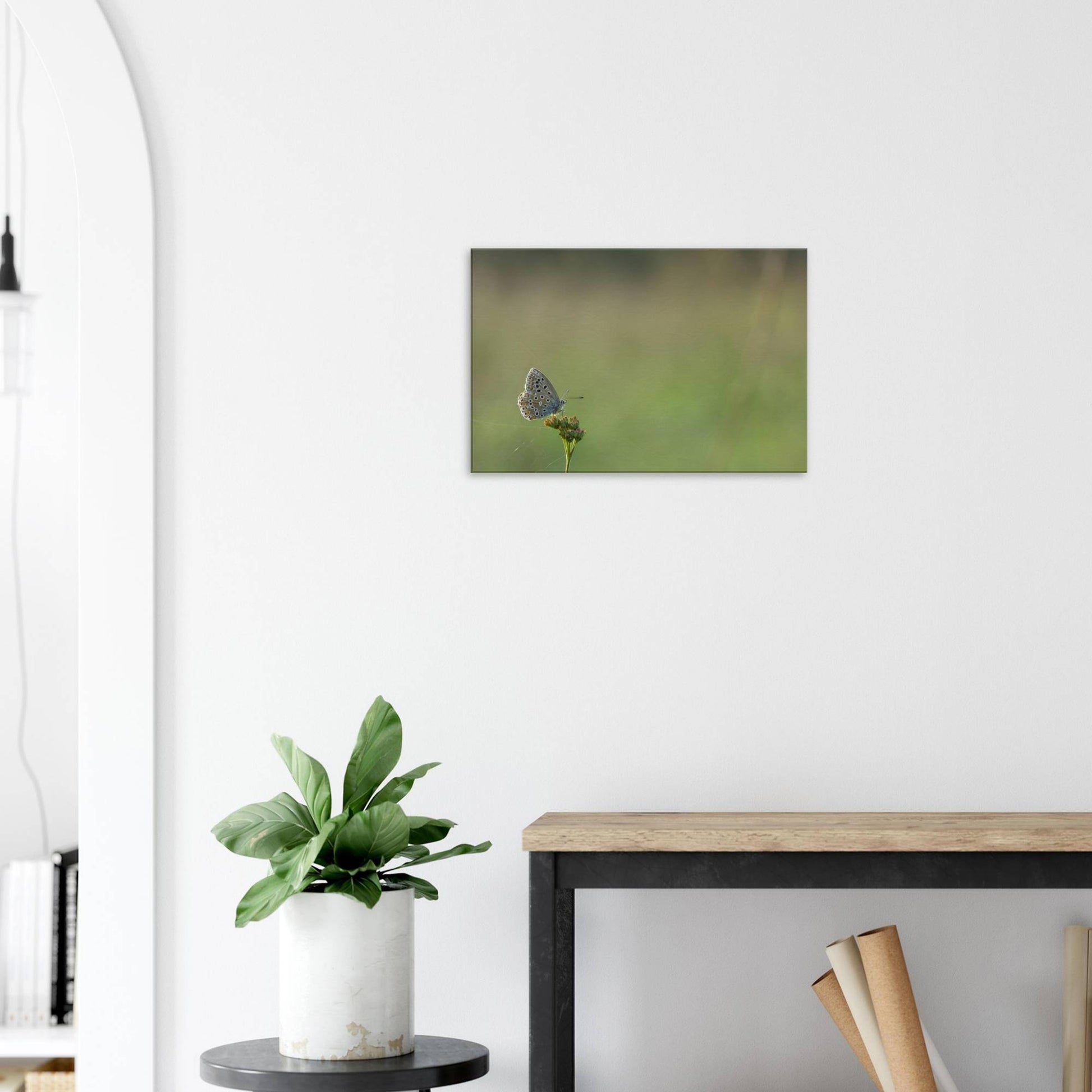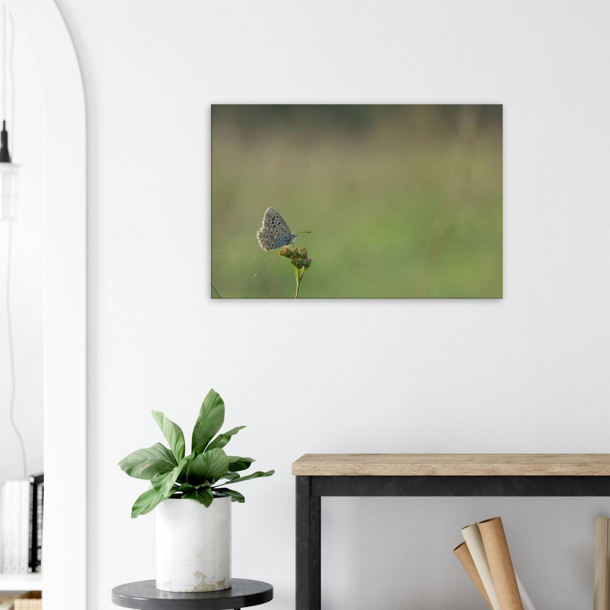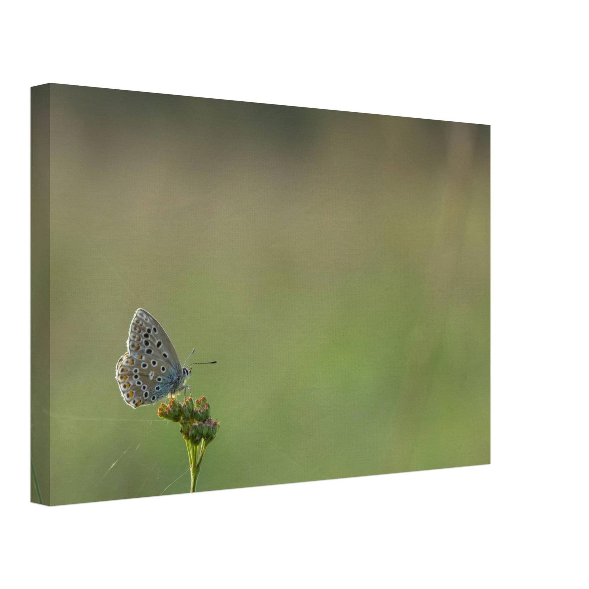 A Common Blue butterfly sitting on a flower that is held together by spiderwebs.