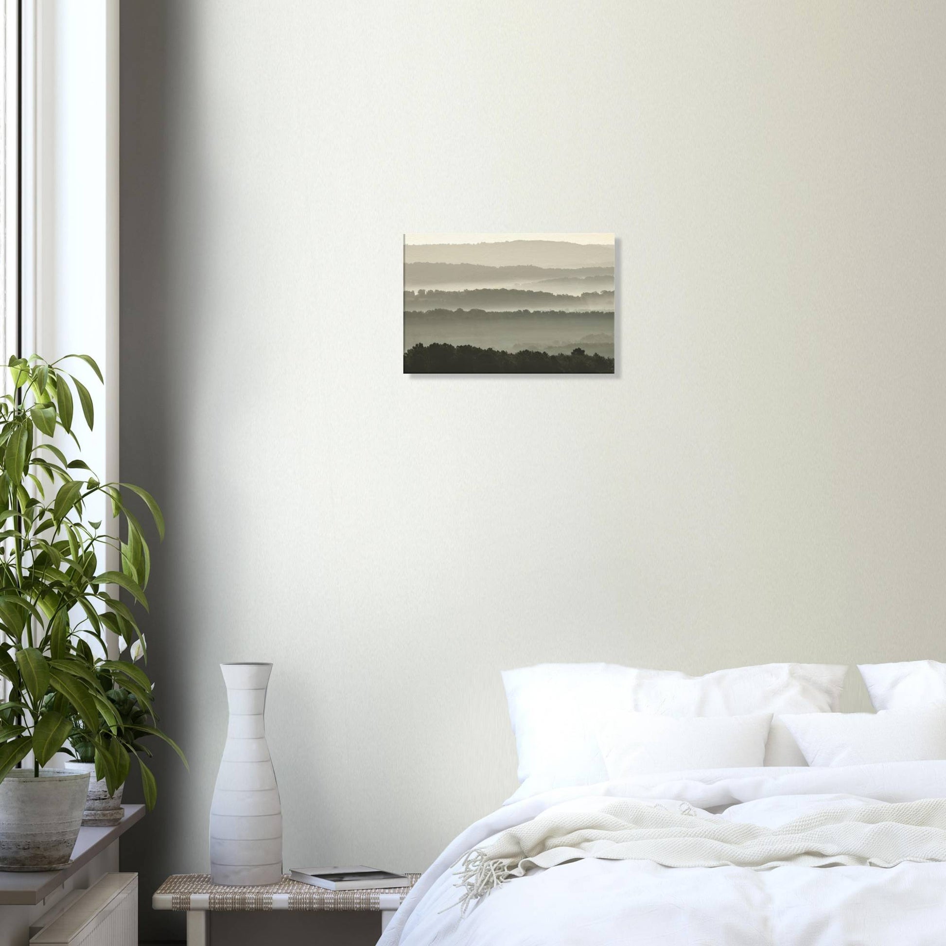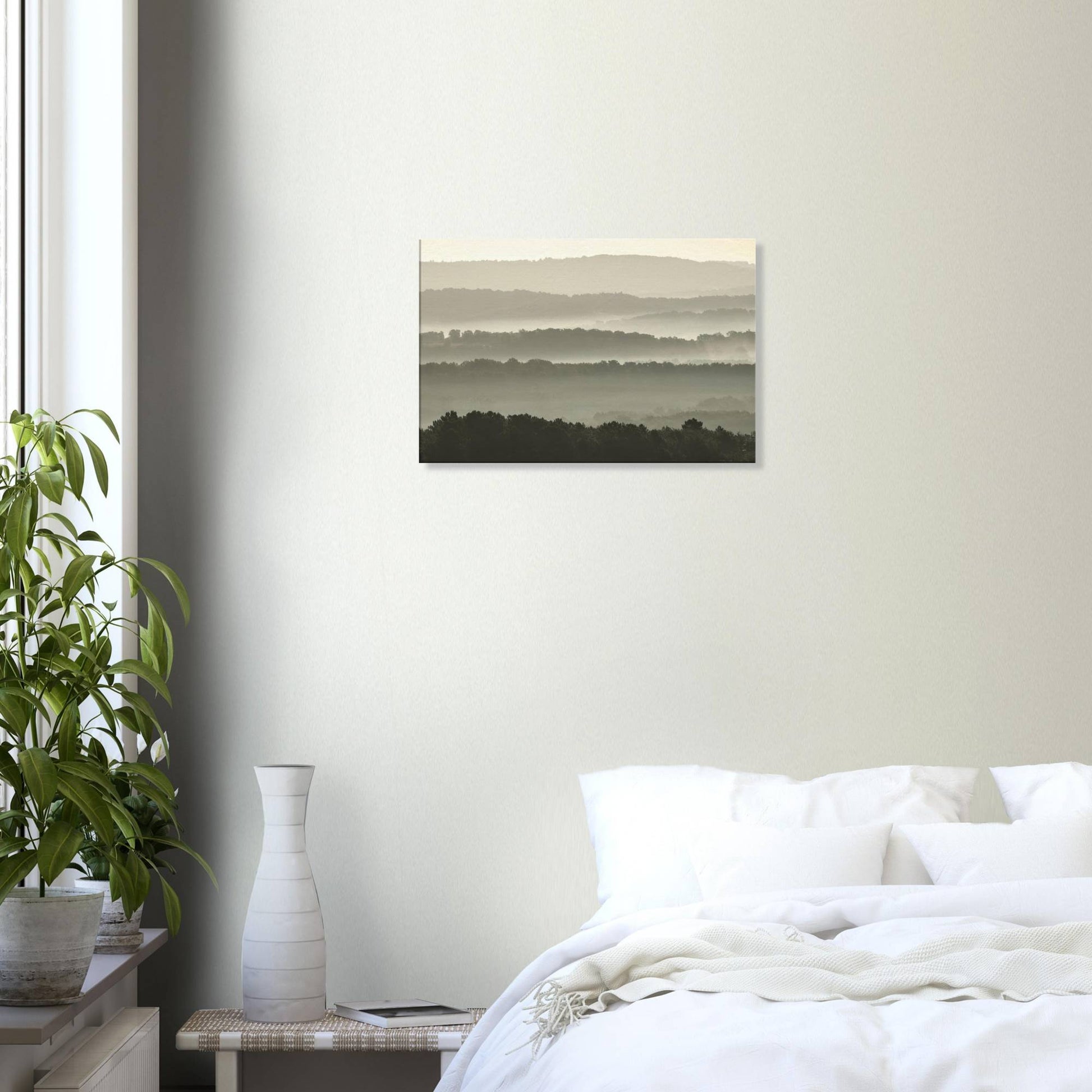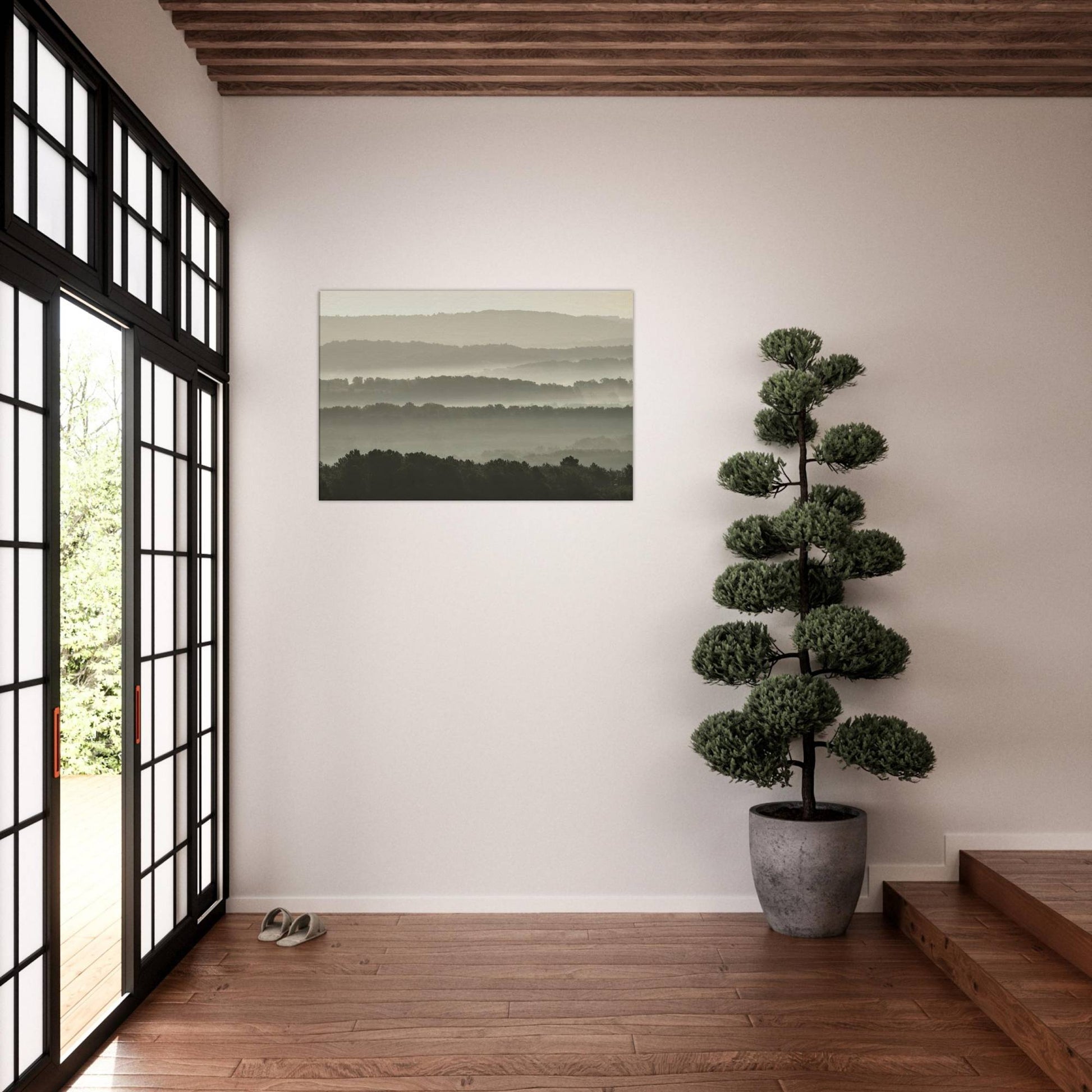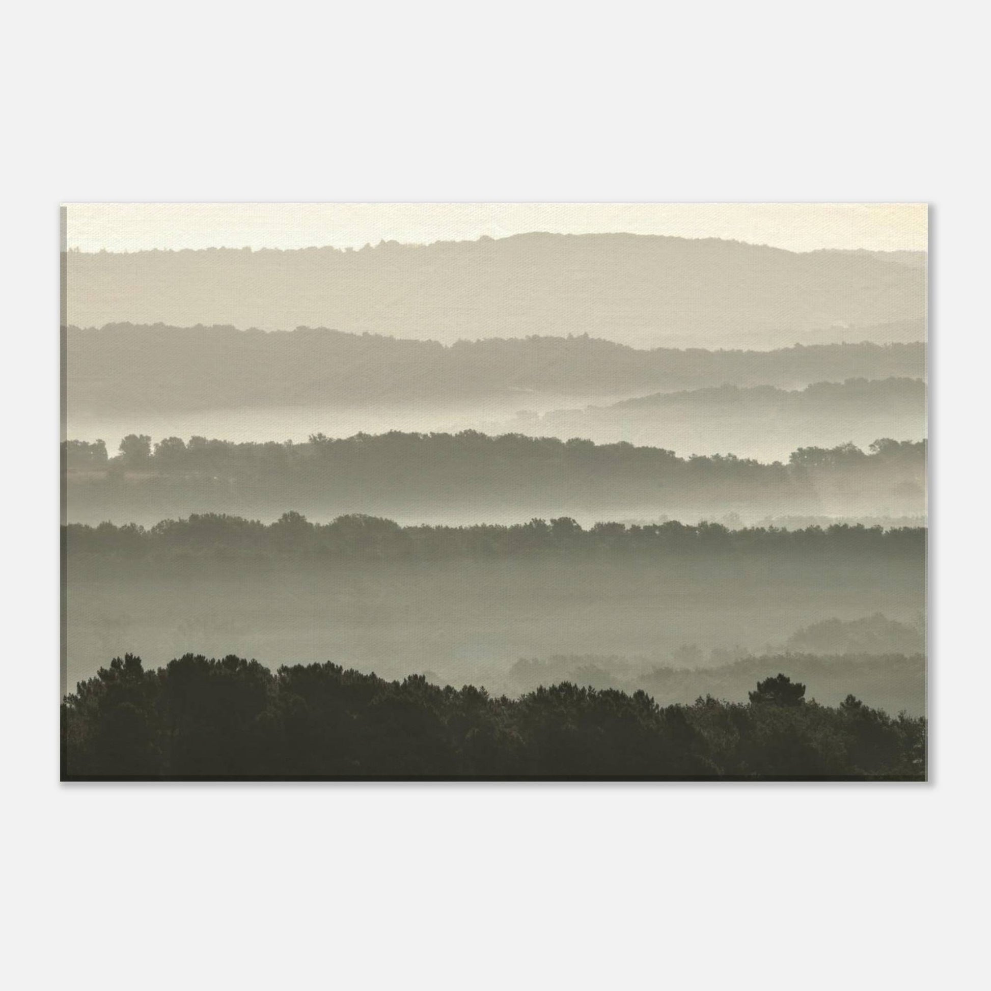 Layers of mist enveloping hilly landscapes.
