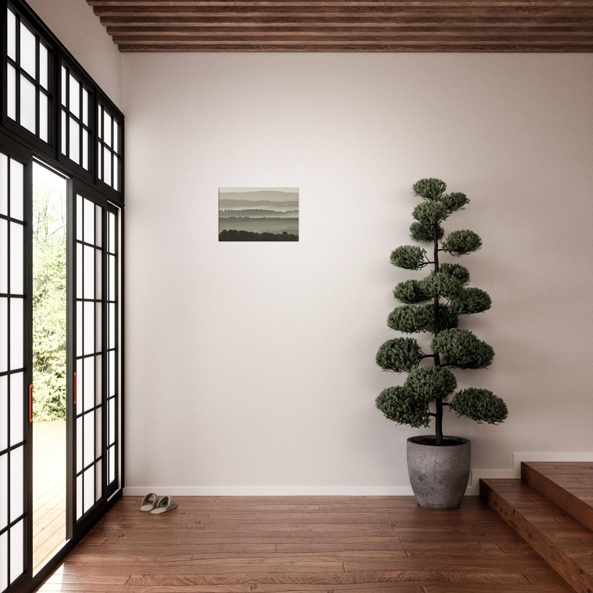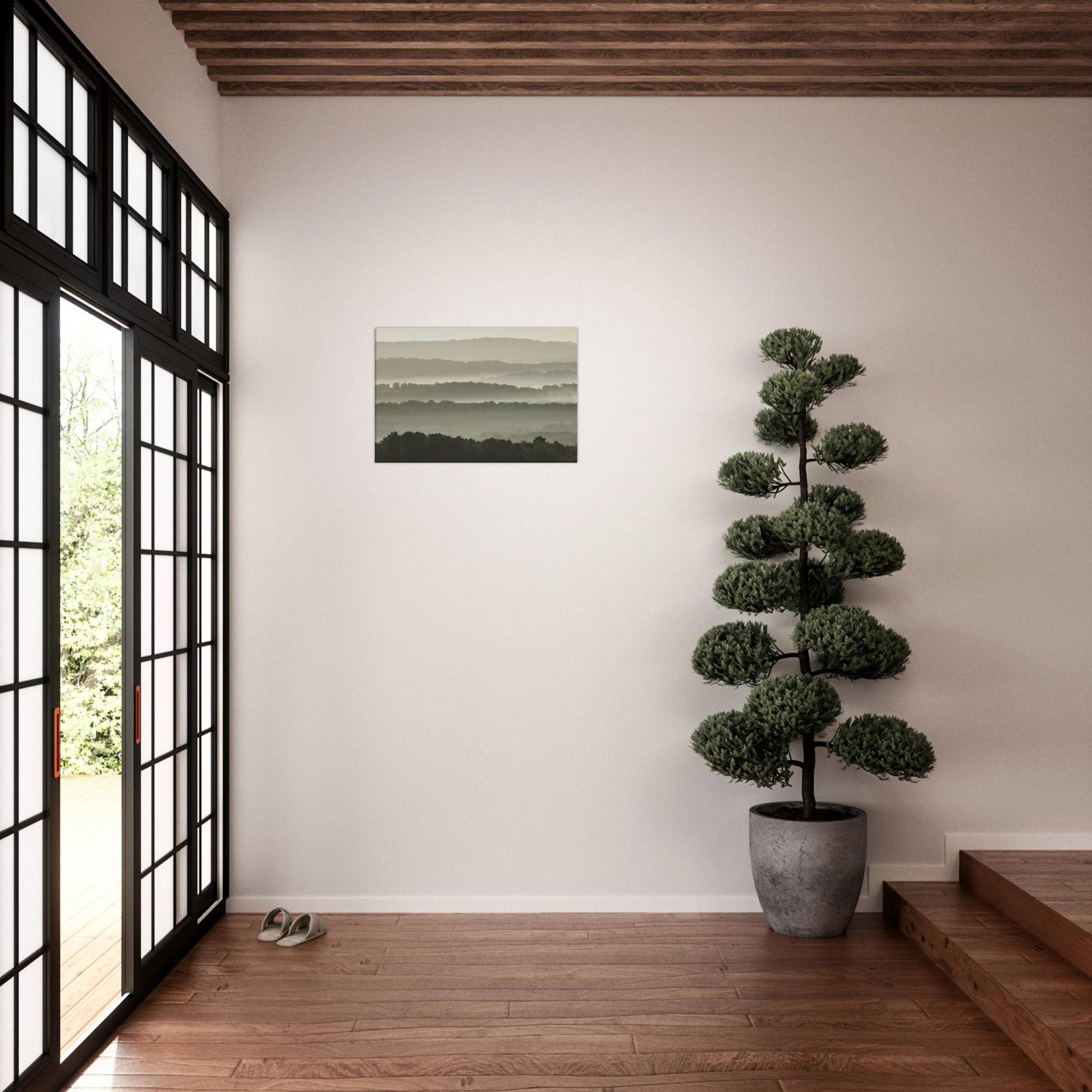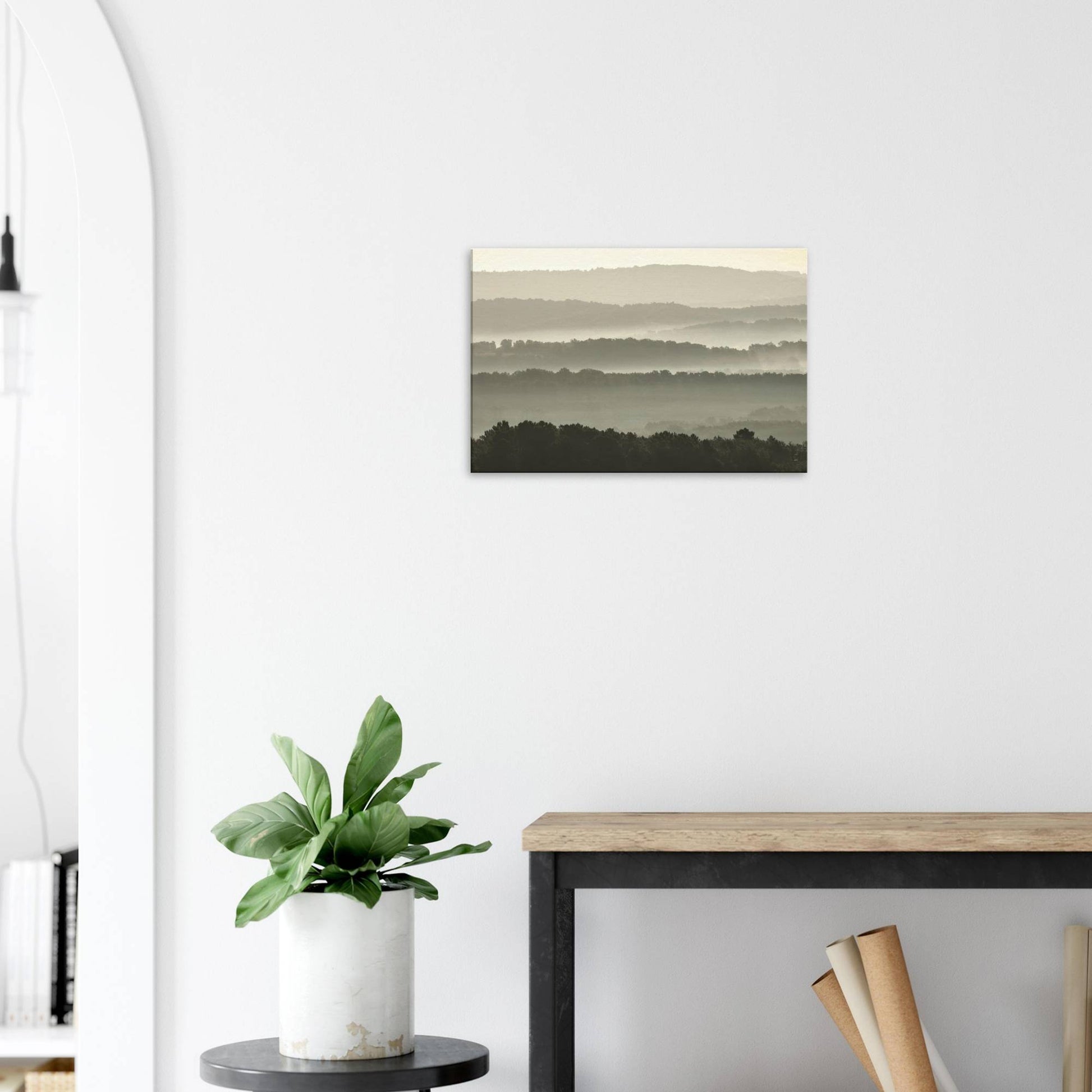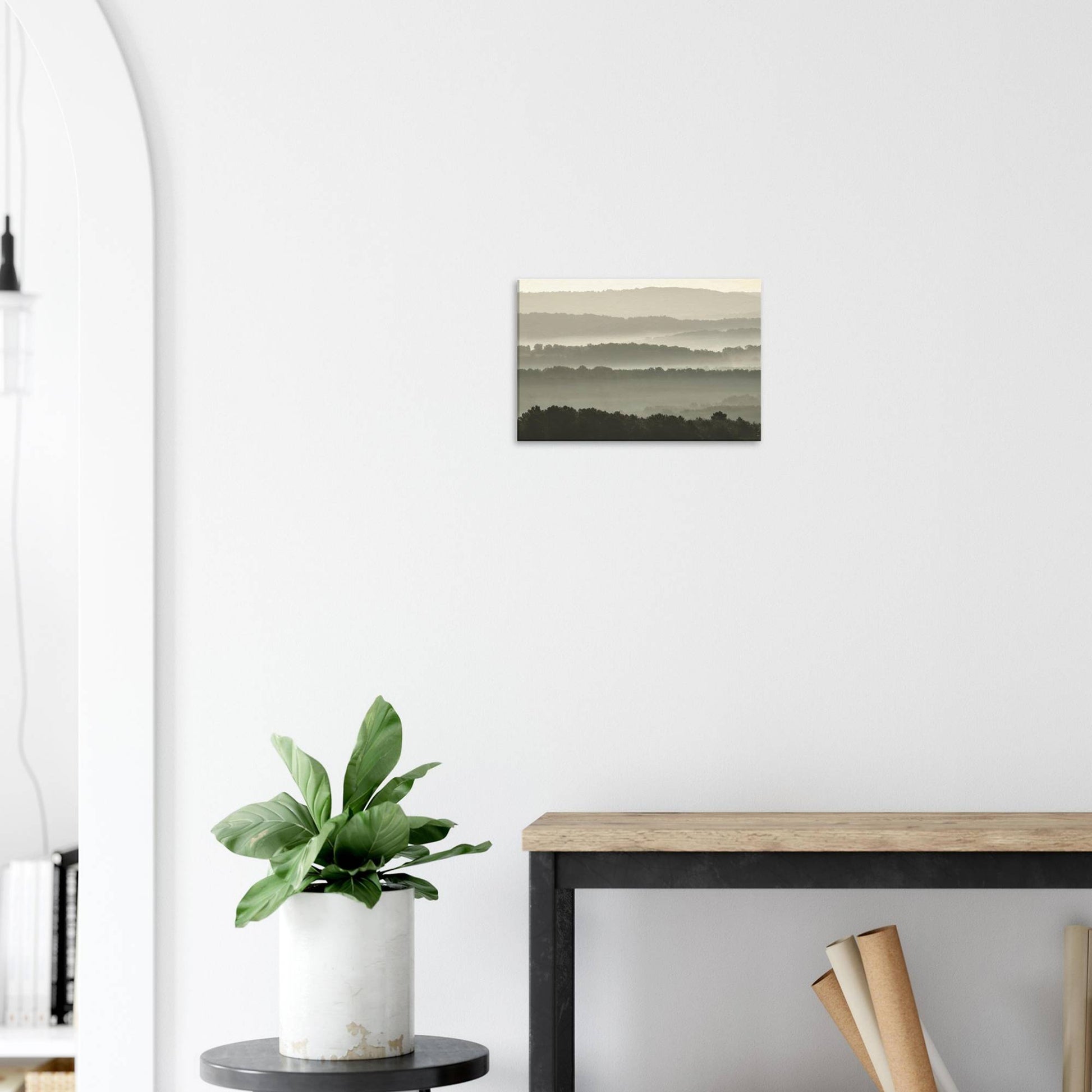 Layers of mist enveloping hilly landscapes.